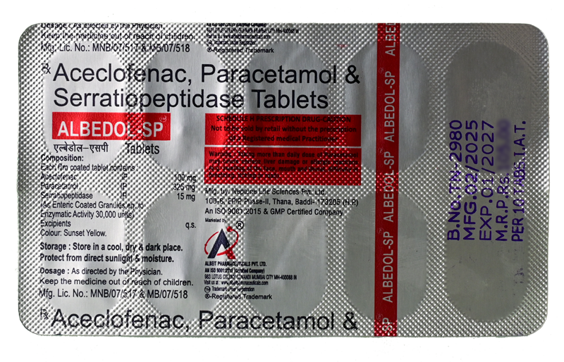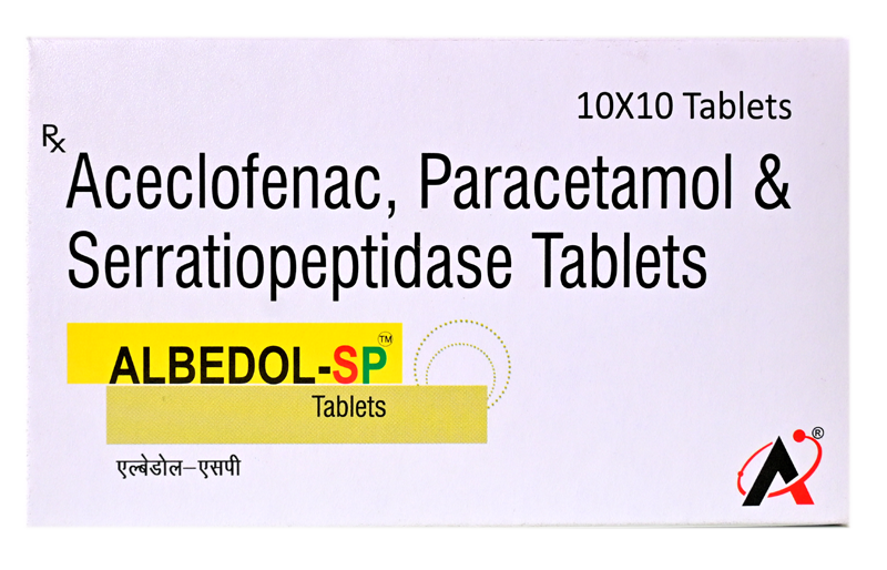 ALBEDOL-SP Tablet is a combination medicine used for the management of pain, inflammation, and swelling associated with musculoskeletal and joint disorders. It is effective in relieving pain in conditions such as rheumatoid arthritis, osteoarthritis, ankylosing spondylitis, and postoperative pain.