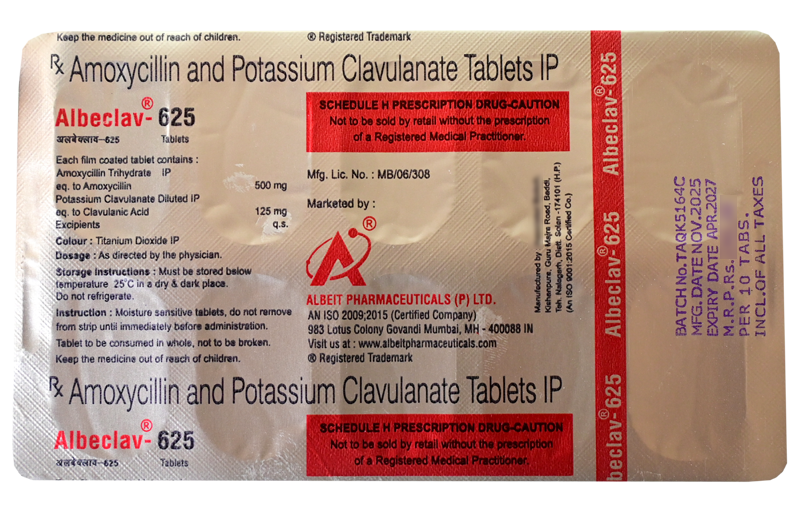 Albeclav 625 Tablet is an antibiotic that helps your body fight infections caused by bacteria. It is used to treat infections of the lungs (e.g., pneumonia), the ear, the nasal sinus, the urinary tract, the skin, and the soft tissue. It will not work for viral infections such as the common cold.